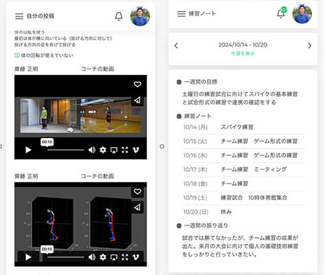 また、ビフォーアフター動画も自動作成されるので、前回からの成長の見える化も行えます。指導動画で取り組んだ練習を、スマホで撮影・投稿。